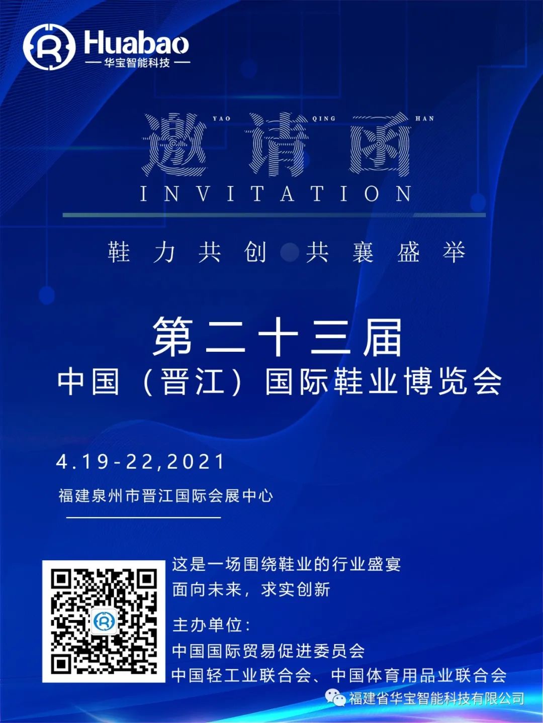 福建省華寶智能科技有限公司將于4月19日-22日參加2021年第二十三屆中國(晉江)國際鞋業(yè)博覽會,屆時(shí)誠邀您的蒞臨參觀指導(dǎo)!